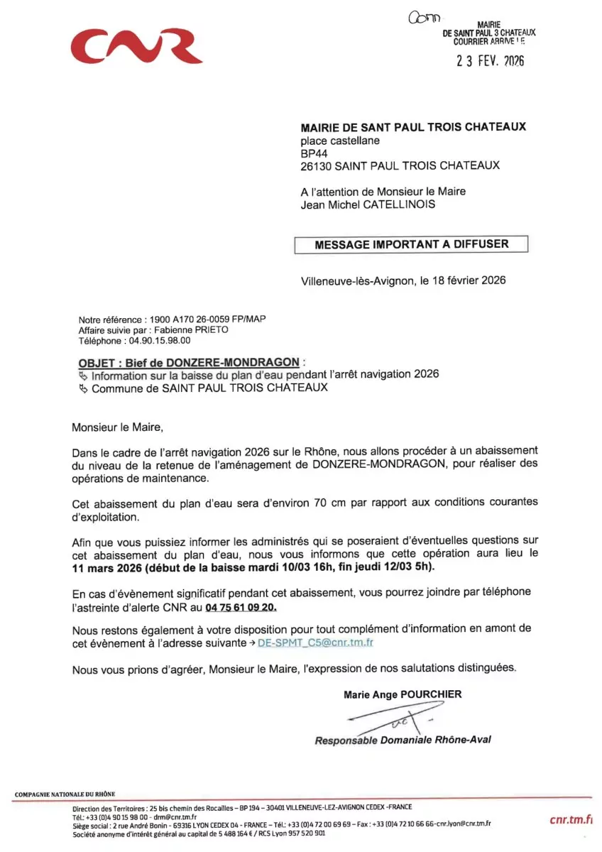 La Ville de Saint-Paul-Trois-Châteaux informe les habitants qu’un abaissement temporaire du niveau du Rhône sera effectué dans le bief de Donzère-Mondragon, dans le cadre de l’arrêt de navigation 2026. Cette opération permettra la réalisation de travaux de maintenance sur l’aménagement de Donzère-Mondragon, menés par la Compagnie Nationale du Rhône (CNR).