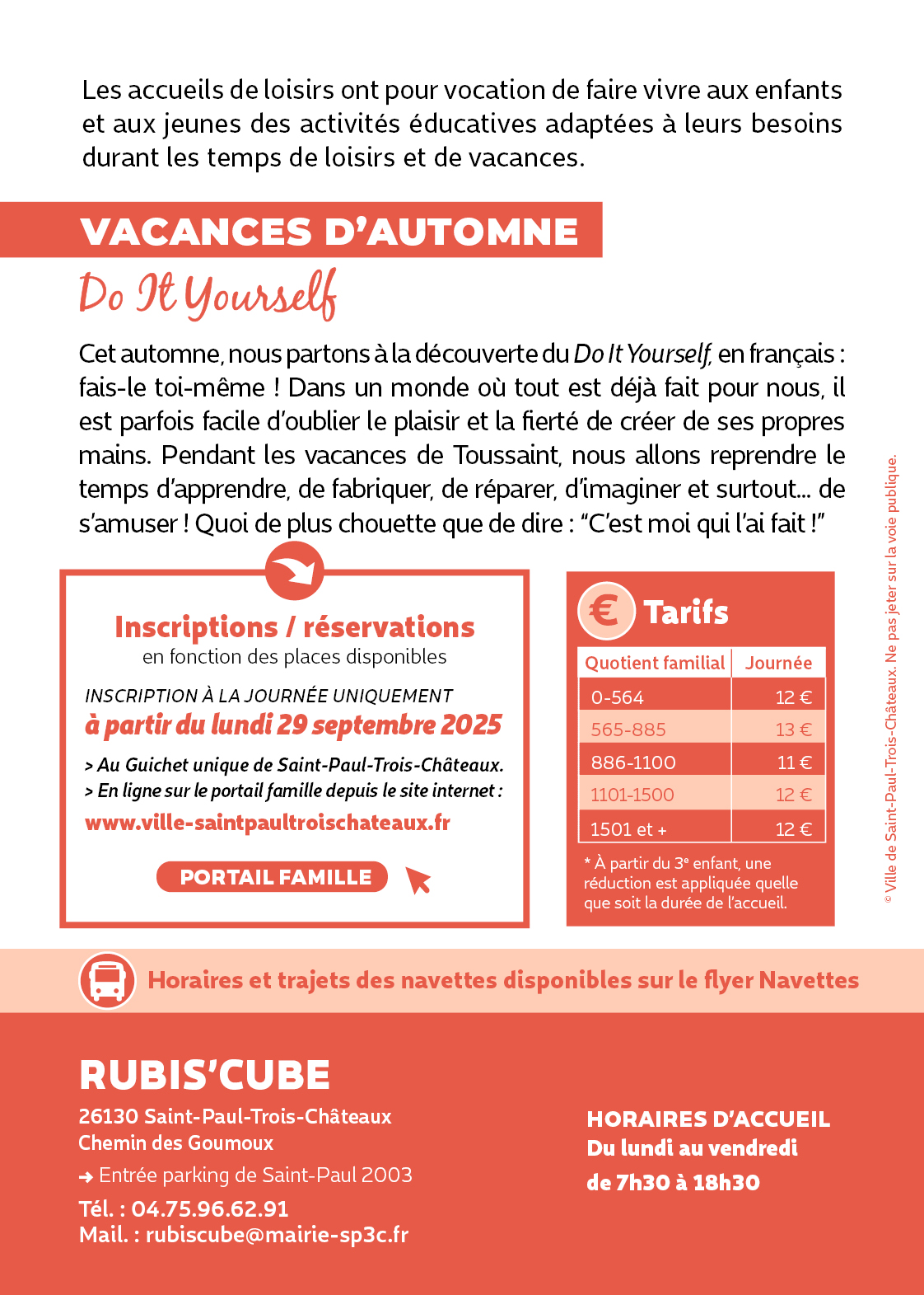 Cet automne, nous partons à la découverte du Do It Yourself, en français : fais-le toi-même ! Dans un monde où tout est déjà fait pour nous, il est parfois facile d’oublier le plaisir et la fierté de créer de ses propres mains. Pendant les vacances de Toussaint, nous allons reprendre le temps d’apprendre, de fabriquer, de réparer, d’imaginer et surtout… de s’amuser ! Quoi de plus chouette que de dire : “C’est moi qui l’ai fait !”