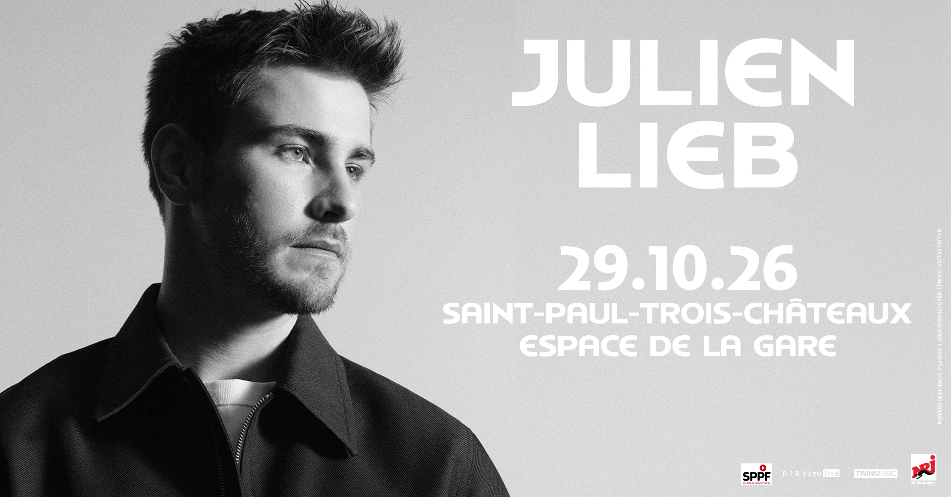 Pour des raisons de planning liées aux répétitions, tournages et primes à venir dans le cadre de la participation de Julien Lieb à Danse avec les Stars, son concert initialement prévu le vendredi 03 avril 2026 à l’Espace de la Gare à Saint-Paul-Trois-Châteaux est reporté au jeudi 29 octobre 2026 à 20H30.