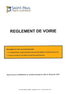 La Ville de Saint-Paul-Trois-Châteaux possède un règlement de voirie qui règlemente la coordination, l’exécution et la sécurité des travaux de voirie et de réseaux divers sur les voies publiques.